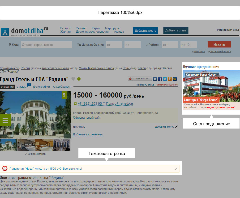 | Размещение в разделе «ДомОтдыха рекомендует» | - | Есть |