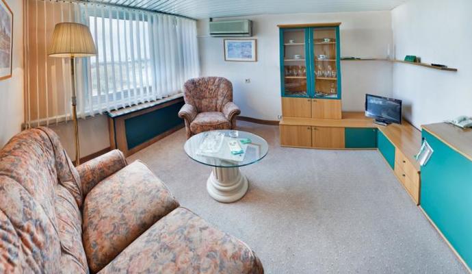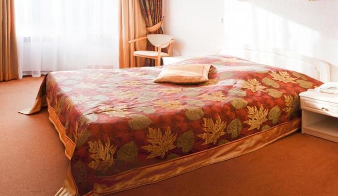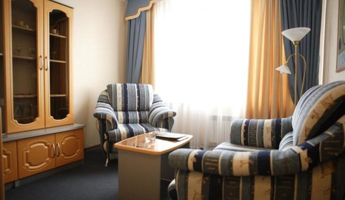 В номерах класса «Люкс» (апартаменты): три комнаты (гостиная, спальня с кроватью шириной 180 см), ванная комната (ванна, душ, биде, фен, тапочки, халат), телевизор (возможность приема спутниковых каналов), телефон с выходом на международную линию, выход в Интернет, мини-бар, сейф, радиоприемник, холодильник.