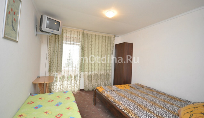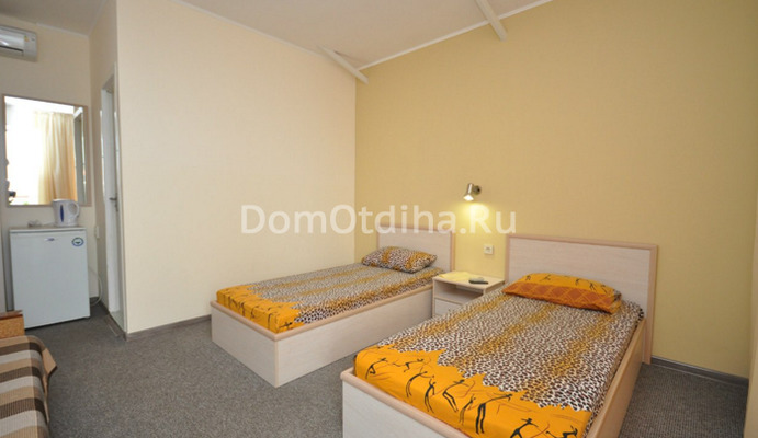 Помимо этого, имеется номер "Стандарт" 4-местный, это двухкомнатный отдельно стоящий летний домик, общей площадью 24 кв.м. В номере две одноместные кровати + одна двухспальная кровать. Шкаф и прикроватные тумбочки в каждой комнате. Холодильник, кондиционер и телевизор, душ, туалет. Балкон (со столом и стульями) с видом на море.