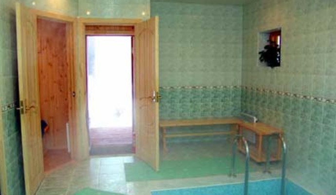 * восьмиместный коттедж (четыре спальни с двуспальными кроватями, в одной из спален дополнительная кровать; просторный холл с мягкой мебелью и камином, телевизор, видео, музыкальный центр, полностью оборудованная кухня с необходимым набором посуды, душ, туалет (импортная сантехника), сауна с предбанником);