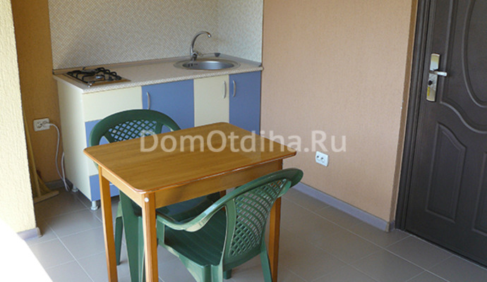 К каждому номеру прилегает просторный балкон-терраса (площадью 11 м2) оборудованный кухней (раковина с г/х водой, газовая плита, холодильник, стол со стульями и набор посуды).