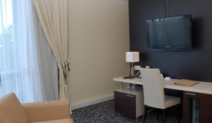 * "Люкс" (34 кв. м) - 2 односпальные кровати, рабочий стол, диван, сейф, минибар, ЖК телевизор, проводной Интернет, телефон, ванная, фен;
