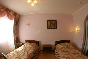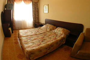 Двухкомнатный номер Люкс состоит из комнаты отдыха, спальни, прихожей и санузла. омер оборудован сплит-системой, холодильником-мини-баром, цветным телевизором, мебелирована двуспальной или двумя односпальными кроватями, диван-кроватью, журнальным столиком, тумбочками, на балконе пластиковая мебель, в прихожей шкаф-купе с зеркальной дверью, в сан. узле - душевая еврокабина, умывальник, унитаз.