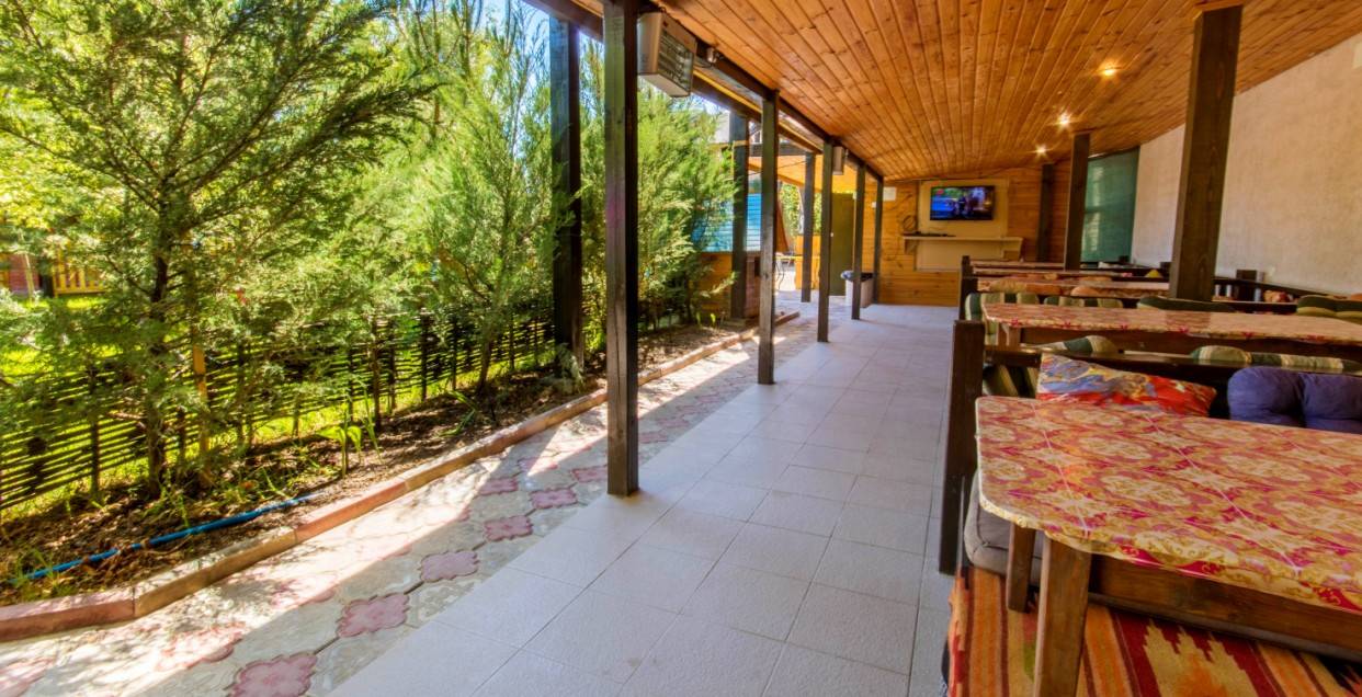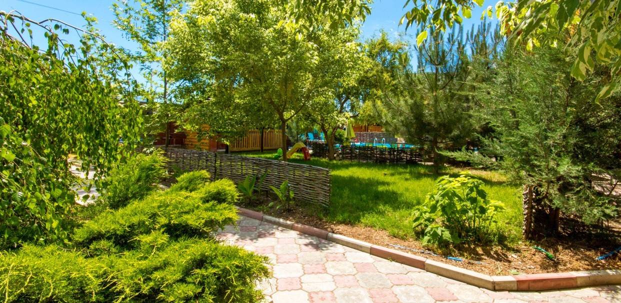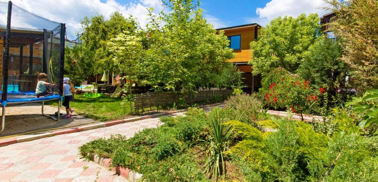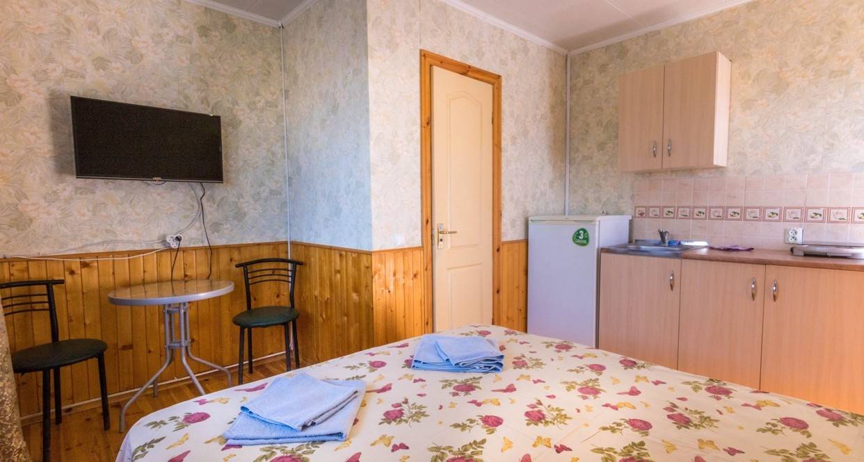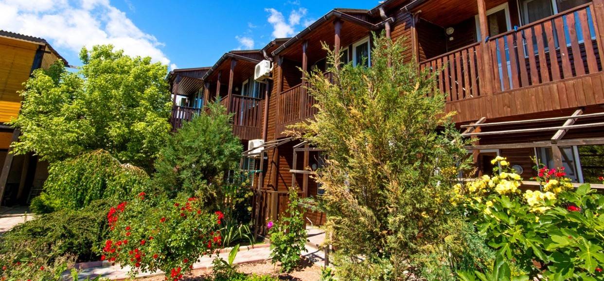 Тихое место,для отдыха с детьми, достаточно далеко до набережной(12-15мин ходьбы), чтобы не находиться с утра до ночи на"дискотеке". Кому надо за день несколько раз сбегать на море,вечером в ресторан или на дискотеку - наш отель не подходит. Наша специализация - безопасное,тихое место для детей, где они на виду и в тоже время сами по себе, и отдых родителей в том числе и от детей- у нас в каждом номере полноценная кухня (с холодильником), поэтому комплексного питания мы не организовываем. У нас есть домашние разнообразные завтраки на выбор 100-150 руб.,обеды организовываем, только если будет заказ -самое простое, недорого. А на ужин мы устраиваем вечеринку какой-нибудь национальной кухни (может быть баранина, рыба на мангале, морепродукты, плов. Но в принципе мы подстраиваемся под клиента - если необходимо комплексное питание то мы организуем (уже на месте обговорим меню и цену). На набережной аквапарк, пляж (песок). Мы организовываем (платно ,но дешевле чем везде) трансфер: отвезти - забрать на пляжи бухты Меганом (красивое и чистое море),поездки в Топловский монастырь с купальнями, самый большой в Европе сафари-парк "Тайган".