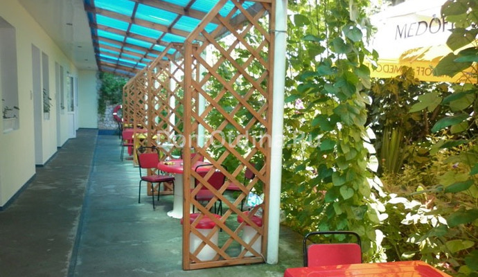 Напротив каждого номера отдельная зеленая беседка с пластиковой мебелью для отдыха. На территории пансионата есть уютный дворик с мангалом и барбекю, бесплатная стоянка для авто, уголки для отдыха, качели.