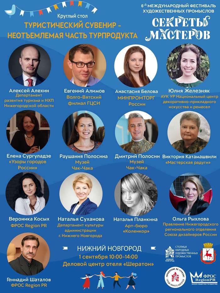 1 сентября в Деловом центре отеля «Шератон» в Нижнем Новгороде состоится круглый стол «Туристический сувенир - неотъемлемая часть турпродукта», который пройдет в рамках Международного фестиваля народных художественных промыслов «Секреты мастеров» (начало в 10:00). Организаторами мероприятия выступают Департамент культуры администрации города Нижнего Новгорода и ФРОС Region PR.