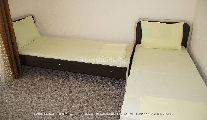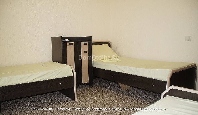 2х, 3х, 4х, 5 местные номера с кондиционером и без кондиционера. Наш отель находится в уникальном месте поселка "Заозерное" (8 км от Евпатории) - где до пляжа всего 600 м и вокруг добродушные соседи, птицы, бабочки и кузнечики. Пляж песчаный и свободный от застроек, вода в море чистая, так как на берегу нет промышленных заводов и фабрик, огромных пансионатов и санаториев, а значит нет в стоков в море. На пляже всегда есть места и вам не придется с вечера оставлять покрывало, чтобы завтра хватило места прилечь. Благоприятное сочетание солнца, моря, морского и степного воздуха - наилучшее лечение для тех, у кого проблемы с легкими, аллергией, ухо - горло - нос...