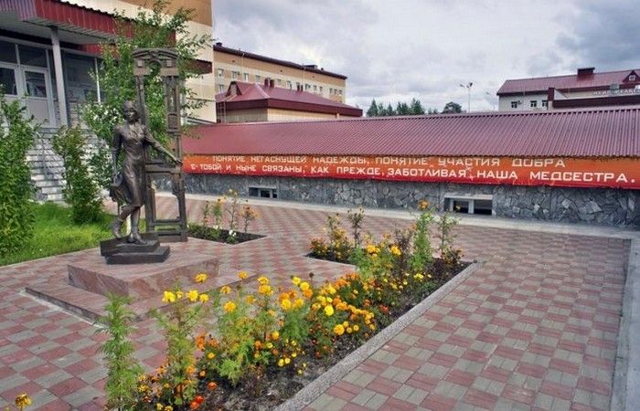 Основная часть достопримечательностей на пути к Ханты-Мансийску находится в Сургуте. Прежде всего, это памятник медсестре. Ее изобразили худенькой девушкой с тяжелым чемоданом, в зимних ботинках и халате. Медицинским работникам эта скульптура очень нравится.