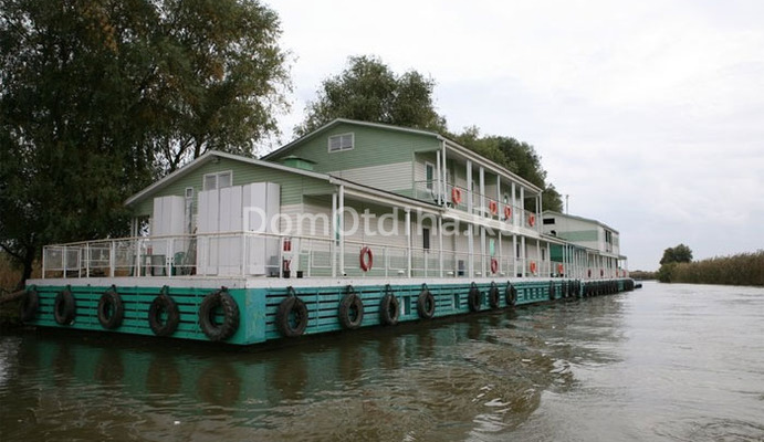 Двухэтажный дебаркадер, с нулевым этажом, состоит из двух корпусов: спальный корпус и развлекательный центр. Специализирована гостиница для рыбаков, охотников, подводных охотников и фотоохотников. Апартаменты на 2-м этаже, номера "Люкс", ресторан-бар с развлекательным центром на 1-м этаже. Номера "Полулюкс", сауна с бассейном, комната отдыха, SPA-центр, турецкая баня на 6 посадочных мест, инфракрасная сауна, солярий, душевая кабина с гидромассажем, кабинет для массажа обычного и процедуры хамам. Напряжение электросети 220V. Подача электроэнергии и воды круглосуточно. на кормовой площадке установлены шкафчики для удилищ и снастей, а также морозильник для рыбы и дичи. Магазин рыболовных принадлежностей. Пункт продажи и проката всего необходимого снаряжения и оборудования для погружения. Полностью кондиционированный, телефонизированный, имеет автономную систему очистки сточных вод и автономную систему отопления.