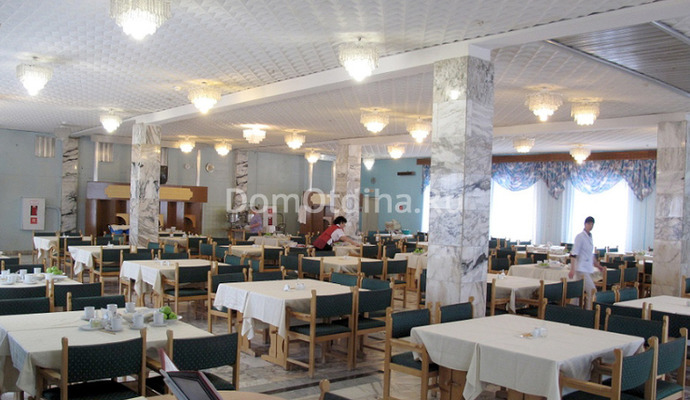 Гости санатория могут не волноваться о завтраках, обедах и ужинах. Здесь Вас ждет уютная столовая санатория, которая рассчитана на двести человек. Прохладительные напитки можно найти в местном баре. Гостям санатория предлагается четырехразовое питание, состоящее из вкуснейших и полезных блюд, которые насыщены витаминами. К тому же здесь учтен и диетический рацион.