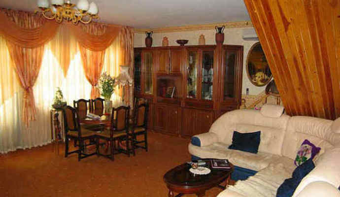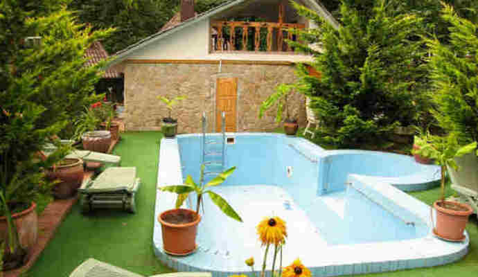 Отель сдается целиком, или отдельно по номерам. * На первом этаже находится: холл, санузел, полностью оборудованная кухня-столовая, совмещенная с каминным залом, стеклянный эркер, два выхода на круговую веранду, двухместный номер с французской кроватью, комод, зеркало, прикроватные светильники. * На втором этаже расположено: два двухместных; трехместный номер с одной двуспальной и одной полутораспальной кроватью, шкафом, прикроватными светильниками, а также на втором этаже находится один санузел: биде, раковина, унитаз и одна ванная комната. * На третьем этаже-мансарде расположены: один трехместный номер и кухня-столовая.